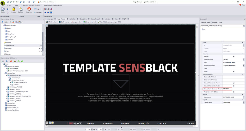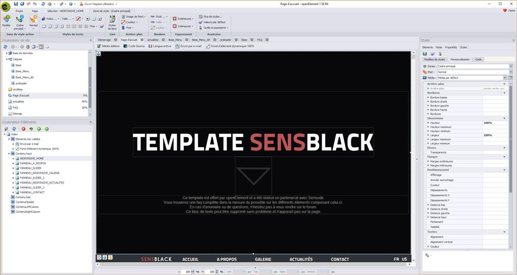 Comme vous pouvez le voir, le template SENSBLACK comporte de tous nouveaux éléments ainsi que du code spécialement développé et intégré au mieux dans openElement.